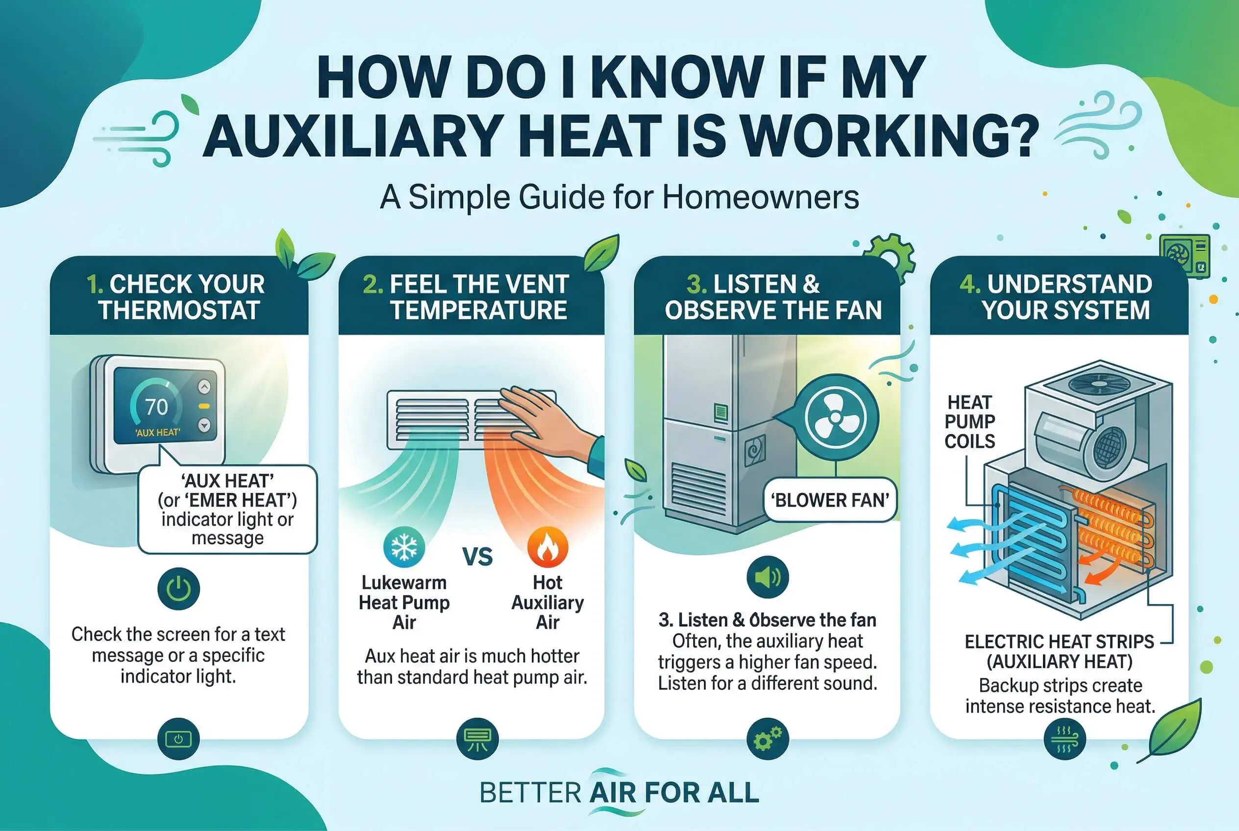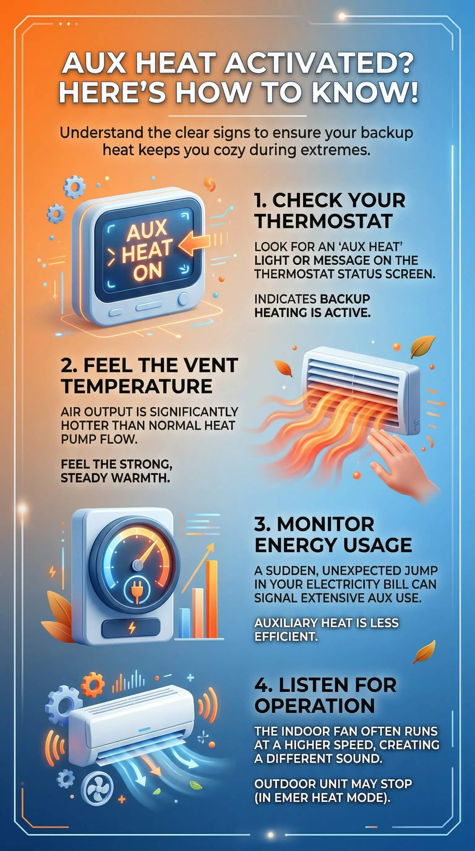 The first step is simply checking your thermostat. Most digital and smart thermostats display an "Aux Heat" or "Aux" indicator when auxiliary heat is actively running. If outdoor temperatures are below 40°F and you see that indicator, your system is engaging the backup heat as designed.